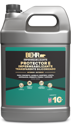 BEHR® Protector e Impermeabilizante para Concreto y Mampostería es un recubrimiento de silicón a base de agua que protege contra la humedad. De gran rendimiento y durabilidad. Para uso interior y exterior. Protege muros, pisos y plafones impidiendo la filtración de agua, sales contaminantes y hongos.